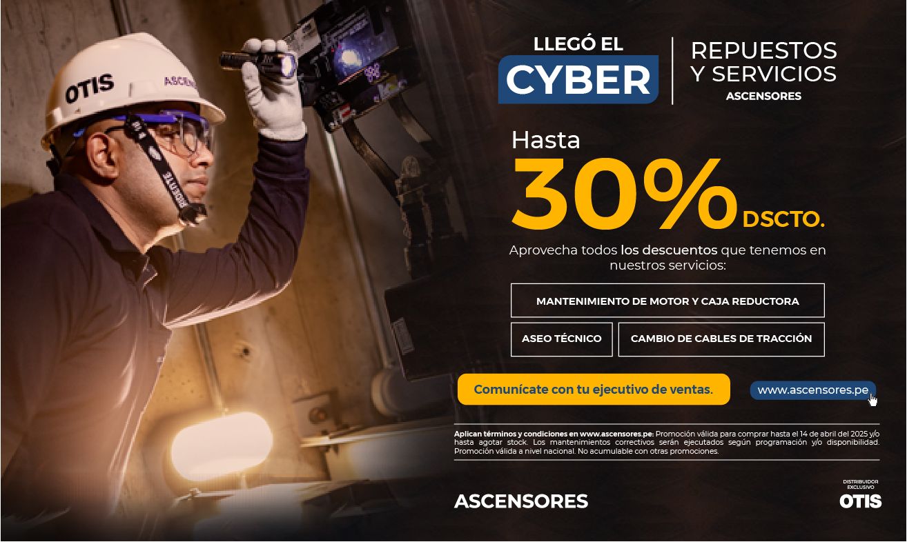 Términos y condiciones: Aplican términos y condiciones en www.ascensores.pe. Promoción válida para compras al 15 de diciembre del 2025 o hasta agotar stock. No incluye trabajos adicionales que puedan surgir durante la ejecución. Los mantenimientos correctivos se programarán de acuerdo con la disponibilidad. Válido únicamente en Lima. No acumulable con otras promociones.
